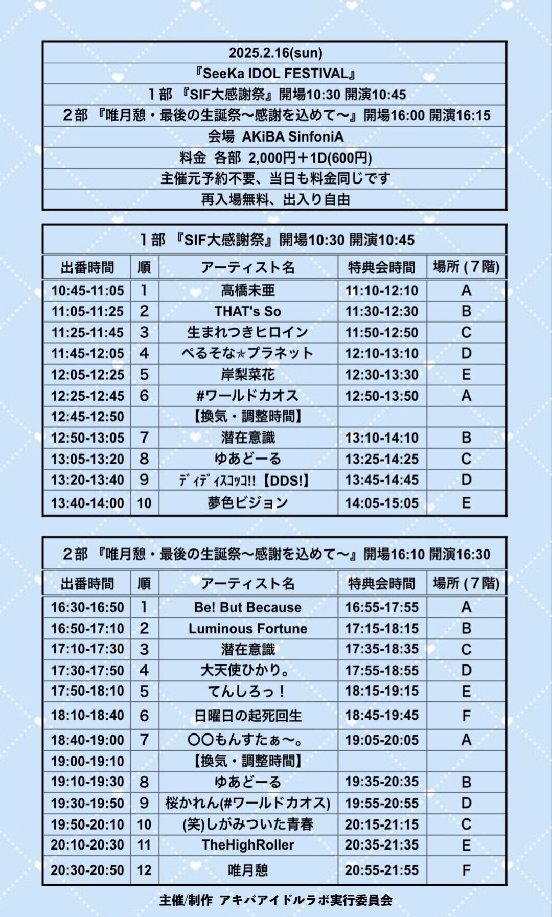 Schedule BACK TO LIST 2025.2.16[Sun] 秋葉原sinfonìa SIF大感謝祭〜SeeKa IDOL FESTIVAL〜 【予約なし】 SIF大感謝祭〜SeeKa IDOL FESTIVAL〜 料金2000円(+1D) 再入場無料 オープン10:30 スタート10:45 出番11:25〜11:45 特典会11:50〜 VENUE 秋葉原sinfonìa 東京都千代田区 TIME 開場 / 0:00 開演 / 0:00 TICKET 前売 未定 / 当日 ¥ 2,000 ACT
