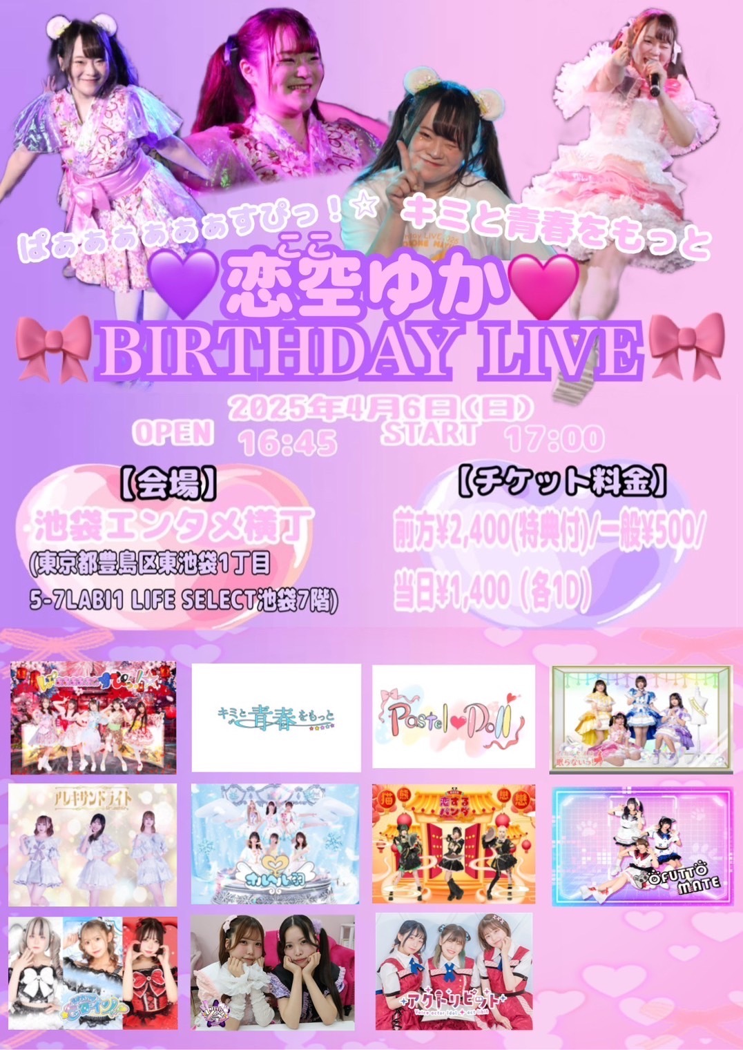 Schedule BACK TO LIST 2025.4.6[Sun] エンタメ横丁 恋空ゆかBIRTHDAY LIVE 4/6(日) 会場:池袋エンタメ横丁さん OPEN16:45/START17:00(予定) 前方¥2,400/一般¥500/当日¥1,400(各1D) ※ 再入場OK 生まれつきヒロイン目当て入場で写メプレゼント VENUE エンタメ横丁 東京都豊島区 TIME 開場 / 0:00 開演 / 0:00 TICKET 前売 未定 / 当日 未定 ACT