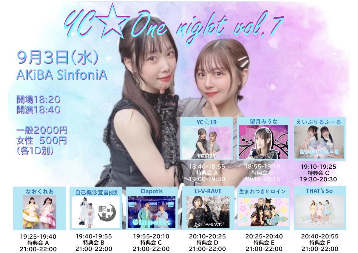 YC⭐︎19/THAT's So/Clapotis/えいぷりるふーる/望月みうな/自己概念宣言β版/生まれつきヒロイン/なおくれあ(プリンセスは眠らないっ!)/Li-V-RAVE/順不同